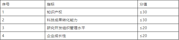 企業(yè)創(chuàng)新能力主要從知識產權、科技成果轉化能力、研究開發(fā)組織管理水平、企業(yè)成長性等四項指標進行評價。滿分為100分,70分以上(不含70分)為符合認定要求。四項指標分值結構詳見下表: