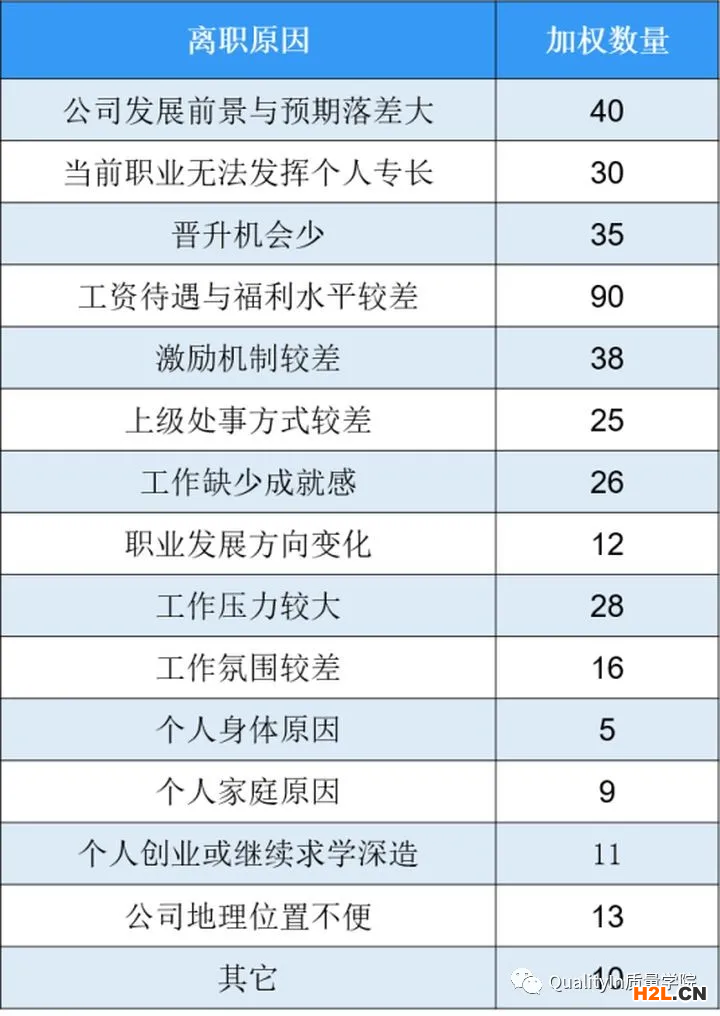 分析總結(jié)可知,資待遇與福利、公司發(fā)展前景與預(yù)期落差大、激勵機制較差、晉升機會少、當前職業(yè)無法發(fā)揮個人專長、工作壓力較大、工作缺少成就感、上級處事方式較差共7個離職因素,占總數(shù)的80%左右是需要關(guān)注的原因。