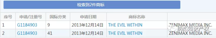 通過商標檢索可看到,ZeniMax Media 在中國申請注冊了2件“THE EVIL WITHIN”商標,分別是第9和41的國際分類。