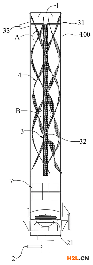 參見圖1和圖2.裝置包括爐體100.生物質(zhì)燃料從進料口1進入爐體100內(nèi)部后向下移動,氣化劑從爐柵21進入爐體100內(nèi)部后向上移動。爐體100內(nèi)設(shè)置有中心管3.生物質(zhì)燃料氣化產(chǎn)生的可燃氣體經(jīng)由中心管3排出爐體100.爐體100內(nèi)還設(shè)置有導(dǎo)流件4.生物質(zhì)燃料5能沿導(dǎo)流件4由上至下流動。
