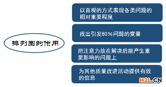1)按重要順序顯示出每個(gè)質(zhì)量改進(jìn)項(xiàng)目對整個(gè)質(zhì)量問題的作用; 2)識別進(jìn)行質(zhì)量改進(jìn)的機(jī)會。 (即識別對質(zhì)量問題最有影響的因素,并加以確認(rèn))