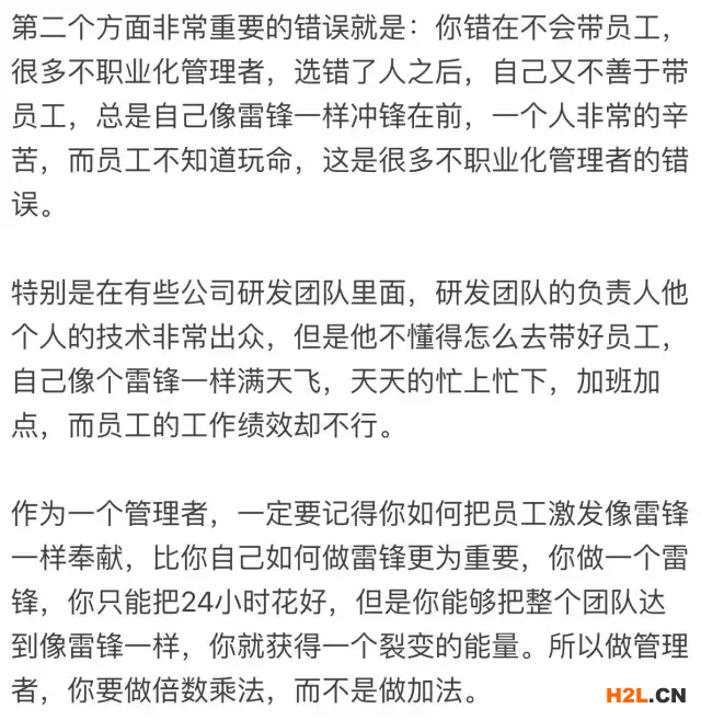 如果說一個員工在適用期之前無能,那么那是他自己的問題,如果一個員工試用期之后還無能,那么就是領(lǐng)導(dǎo)無能,因為試用期之前員工的能力不是由領(lǐng)導(dǎo)決定的,而是由他自己過去職場生涯中所積累的,而過了試用期之后,你把他轉(zhuǎn)為正式員工之后,他還是無能,這說明這是你領(lǐng)導(dǎo)自己眼光和培養(yǎng)能力不足。