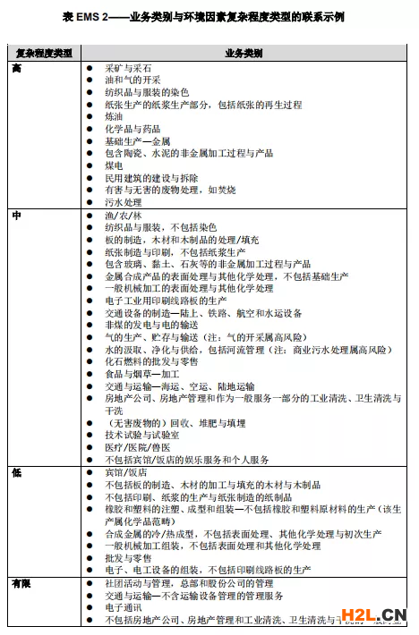 表 EMS 2 將上述 5 種復(fù)雜程度類型與每種類型所覆蓋的典型行業(yè)做了對照。認證機構(gòu)宜認識到,在一個特定行業(yè)中,并不是所有組織都屬于相同的復(fù)雜程度類型。認證機構(gòu)的申請評審程序宜具有一定的靈活性,以確保在確定組織的復(fù)雜程度類型時考慮該組織的具體活動。