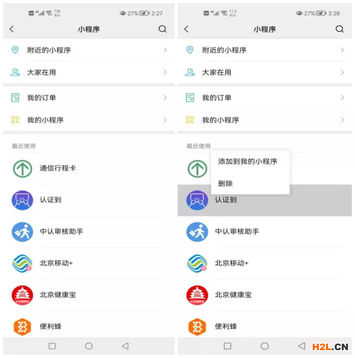 移除:進(jìn)入我的小程序,找到“認(rèn)證到”小程序,長按圖標(biāo),點(diǎn)擊“刪除”;