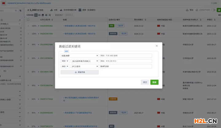在各數(shù)據(jù)庫獨立的語義檢索模塊中操作時,檢索模式并非先布爾后語義的模式,而是采用了相反的先語義后布爾的模式,具體來說,是先通過語義檢索先找出固定數(shù)量的相關專利(例如2000條),再使用布爾限定在已找出來的固定數(shù)量的專利中繼續(xù)篩選符合布爾檢索條件的專利,因此這種模式下,最終的檢索數(shù)量一定小于等于通過語義檢索篩選出的專利數(shù)量,同時也一定小于等于僅布爾檢索條件的檢索結果數(shù)量。