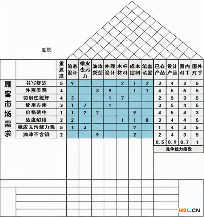 評價每一種需求的重要性,加權(quán)評分,再填入質(zhì)量屋中。針對這么多項需求,按照從小到大的順序,數(shù)字越大表示重要度越高。舉個下面這個質(zhì)量屋的例子,顧客認(rèn)為書寫舒適和橡皮去污能力強的重要度明顯大于價格適中這一項。不同顧客心中的權(quán)重可能有所不同。