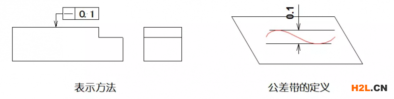 ▲圖樣示例1:在給定平面內(nèi),公差帶必須在距離為0.1mm的兩平行直線間的區(qū)域。
