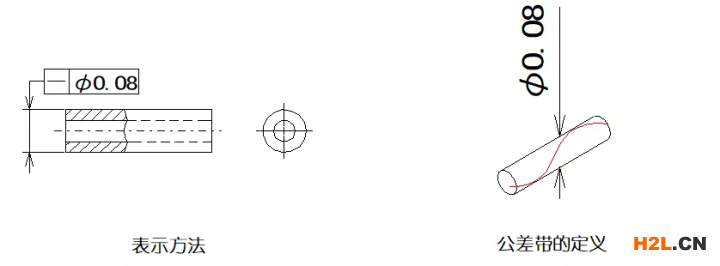 ▲圖樣示例2:在公差值前加注記號(hào)φ、則公差帶必須在直徑0.08mm的圓柱面內(nèi)的區(qū)域。
