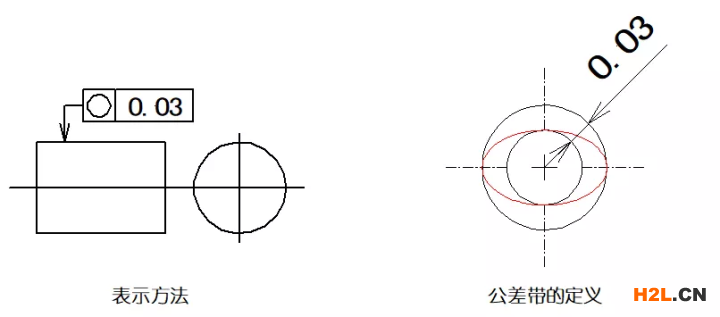 ▲圖樣示例:公差帶必須在同一正截面上,半徑差為公差值0.03mm的兩個(gè)同心圓之間的區(qū)域。