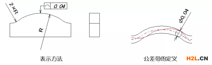 ▲圖樣示例:公差帶是由包絡(luò)一系列直徑為公差0.04mm的圓的兩包絡(luò)線之間的區(qū)域。諸圓的圓心位于具有理論正確幾何形狀的線上。
