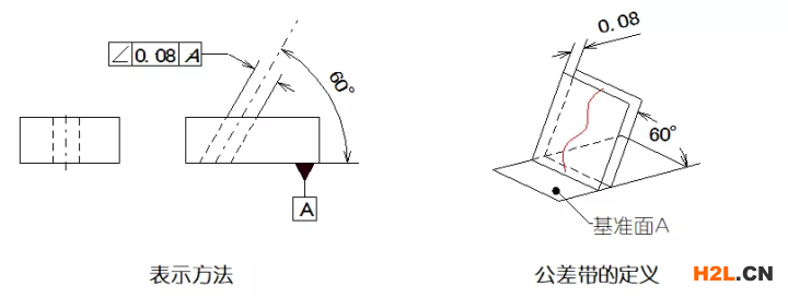 ▲圖例說明:被測(cè)軸線的公差帶是距離為公差值0.08mm,且與基準(zhǔn)面A成理論角度60°的兩平行平面之間的區(qū)域。