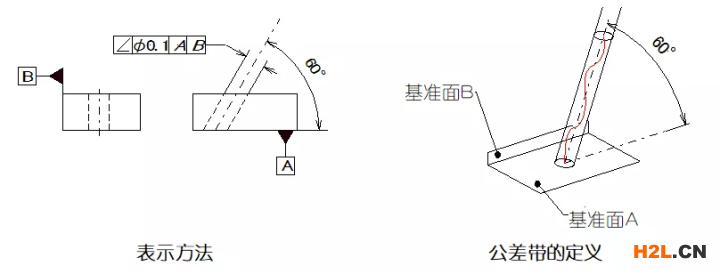 ▲圖例說明:在公差值前加注記號(hào)φ,則公差帶必須位于直徑為0.1mm的圓柱面內(nèi)。該公差帶應(yīng)平行于垂直于基準(zhǔn)A的平面B,并與基準(zhǔn)A呈理論正確角度60°。
