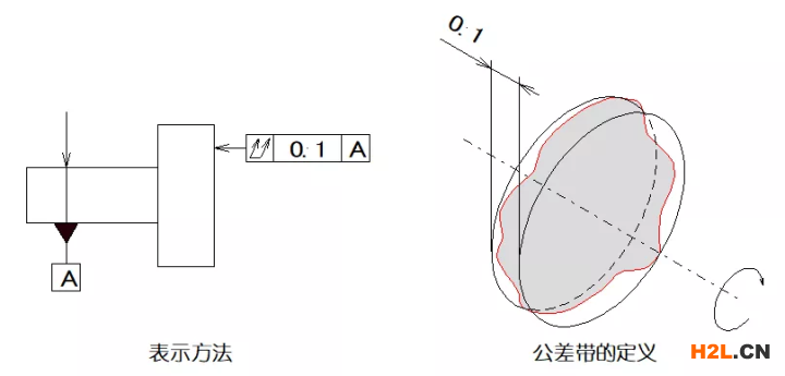 ▲圖樣示例:公差帶是半徑差為公差值0.1mm的兩個(gè)同軸圓柱面之間的區(qū)域。