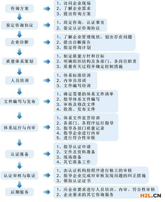 簽認(rèn)證咨詢合同--咨詢專家進場--現(xiàn)場診斷--成立推行小組--培訓(xùn)--體系文件建立--試運行--文件修改 --文件運行--內(nèi)部審核--管理評審--申請認(rèn)證--現(xiàn)場審核 --取證。