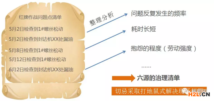 六源的查找不是坐在辦公室里面想出來,或者來個頭腦風(fēng)暴法討論出來的,必須到現(xiàn)場去,觀察現(xiàn)物,了解現(xiàn)實(shí);唯一的方法就是通過反復(fù)的清掃及紅牌作戰(zhàn)找出發(fā)生源和困難源。