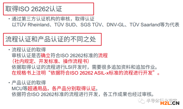 為了幫助大家更進(jìn)一步了解ISO 26262.李春華還對(duì)其進(jìn)行了深入的科普。他指出,對(duì)于企業(yè)來(lái)說(shuō),想取得ISO 26262認(rèn)證,可以通過(guò)TüV Rheinland、TüV SUD和GS TüV等德系檢測(cè)機(jī)構(gòu)獲得,但其中的“流程認(rèn)證”和“產(chǎn)品認(rèn)證”也有不同之處。