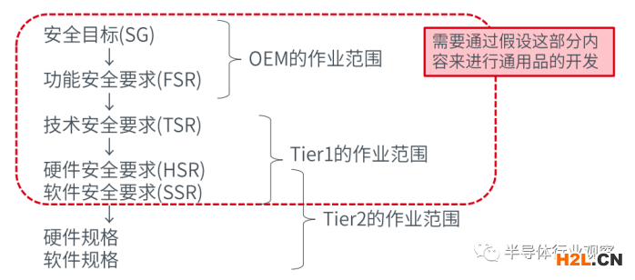 李春華指出,這通常是根據(jù)各個(gè)元器件的安全目標(biāo)當(dāng)中導(dǎo)出的安全要求來(lái)確定產(chǎn)品規(guī)格,從而進(jìn)行硬件及軟件開(kāi)發(fā)。但通用產(chǎn)品因?yàn)闆](méi)有安全目標(biāo)和主要的安全要求,所以需要假設(shè)這部分內(nèi)容來(lái)進(jìn)行開(kāi)發(fā)的規(guī)定。在實(shí)際操作中,則通過(guò)自上而下的一步步拆解而完成的。