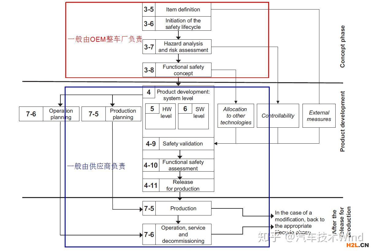 上圖顯示了功能安全開發(fā)的流程和生命周期。主要分為了三部分:1. 概念設(shè)計(jì)階段——一般由OEM整車廠負(fù)責(zé)定義;2. 產(chǎn)品開發(fā)階段——一般由供應(yīng)商負(fù)責(zé);3. 產(chǎn)品量產(chǎn)階段——一般由供應(yīng)商負(fù)責(zé)。