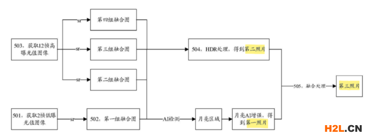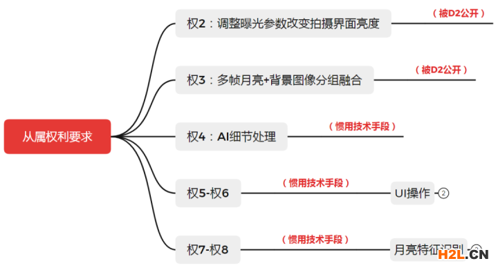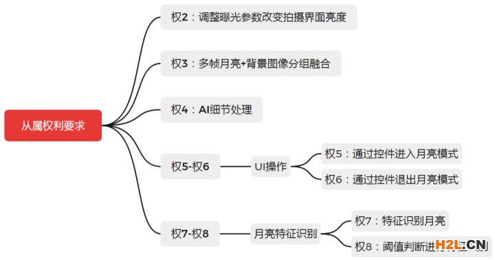 在原申請(qǐng)文件的從屬權(quán)利要求,還針對(duì)調(diào)節(jié)界面亮度、多幀圖像融合、ai處理、UI操作以及月亮特征識(shí)別進(jìn)行了布局,請(qǐng)參考圖2.