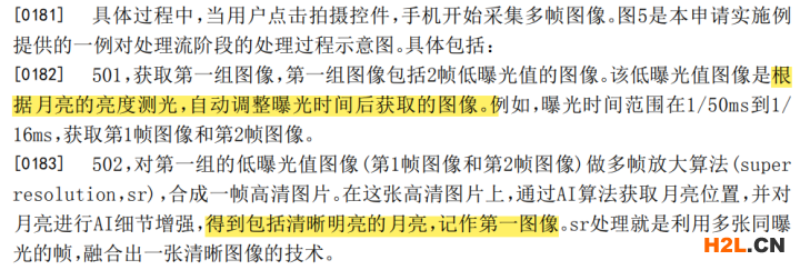 “根據(jù)月亮的亮度測(cè)光,自動(dòng)調(diào)整曝光時(shí)間后獲取包括月亮的第一組圖像”。(筆者注:根據(jù)月亮的測(cè)光,自動(dòng)調(diào)整曝光時(shí)間后獲取的圖像,該圖像包括月亮)。