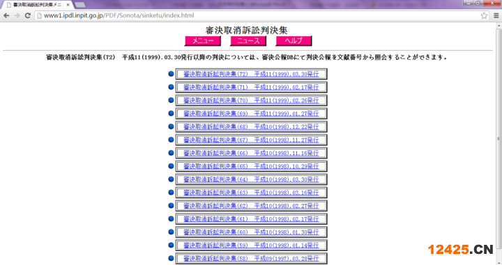 “復(fù)審決定、撤銷、訴訟判決集”可以查詢平成9年3月至平成11年3月間對(duì)復(fù)審決定不服而進(jìn)行的相關(guān)訴訟信息。下圖顯示的是這些文集的一覽表,點(diǎn)擊每個(gè)文集的名稱,即可瀏覽詳細(xì)內(nèi)容。