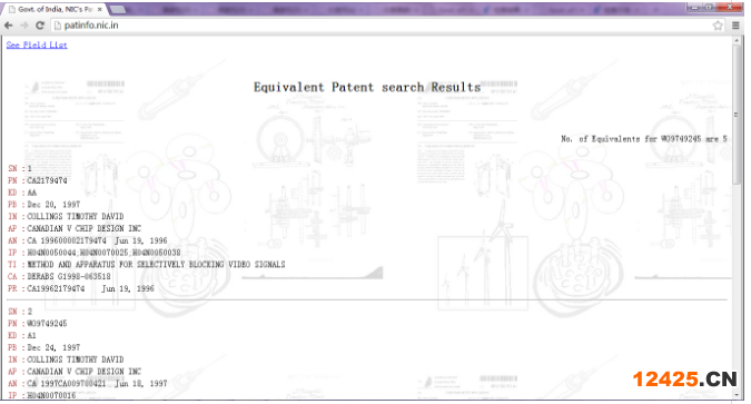 在同族專利檢索結(jié)果界面,系統(tǒng)對(duì)每一篇同族專利都是按字段列出該專利的著錄項(xiàng)目數(shù)據(jù)信息。通過該檢索途徑檢索出的同族專利結(jié)果與用歐洲專利局的esp@cenet系統(tǒng)作出的結(jié)果相似,只是印度國(guó)家信息中心網(wǎng)站專利檢索系統(tǒng)的檢索結(jié)果中有時(shí)會(huì)出現(xiàn)重復(fù)信息,檢索時(shí)需注意。