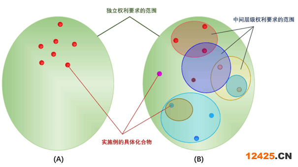 第一方面:在實(shí)施例中公開足夠種類和數(shù)量的具體化合物及其效果驗(yàn)證,并注意合理的分布,使本領(lǐng)域技術(shù)人員根據(jù)本領(lǐng)域普通技術(shù)知識足以確定符合通式的所有化合物均可以解決發(fā)明要解決的技術(shù)問題,達(dá)到預(yù)期的技術(shù)效果。不考慮新穎性、創(chuàng)造性等其他缺陷的情況下,從圖 1 的馬庫什權(quán)利要求的布局示意圖中可以直觀地理解,(A) 方式的布局存在較大的得不到說明書支持的風(fēng)險(xiǎn),而 (B) 方式的布局輔以必要的邏輯推理會把支持性風(fēng)險(xiǎn)大大降低。