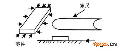 將零件放置在平臺(tái)上,選取相應(yīng)的塞尺測(cè)量零件兩側(cè)或中部與平臺(tái)之間的間隙。