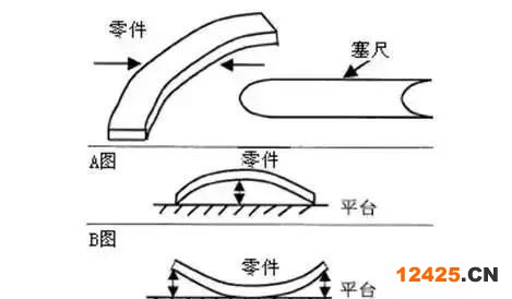 將零件放置平臺(tái)上,用塞尺測(cè)量零件與平臺(tái)之間的間隙(注意:測(cè)量時(shí)塞尺與平臺(tái)保持無(wú)間隙壓緊狀態(tài))