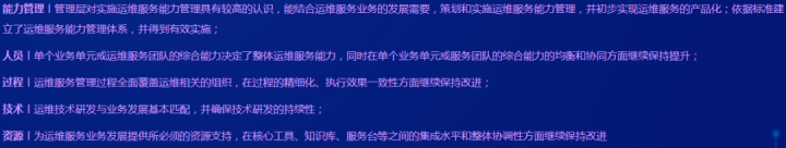 ITSS運(yùn)維服務(wù)標(biāo)準(zhǔn)定義了IT運(yùn)維服務(wù)中人員、過(guò)程、技術(shù)和資源四個(gè)方面的能力要素,并對(duì)這些組成要素進(jìn)行標(biāo)準(zhǔn)化。