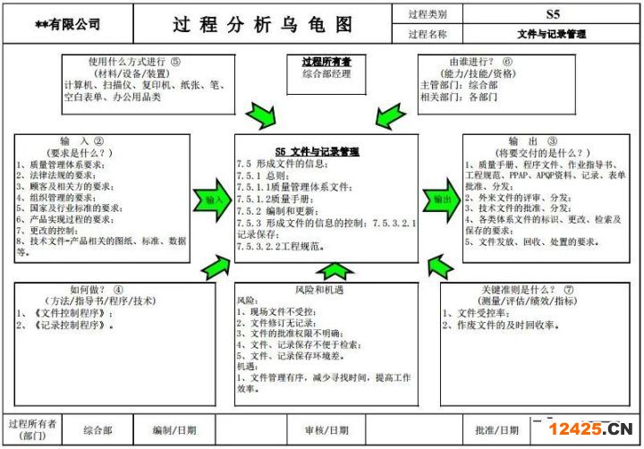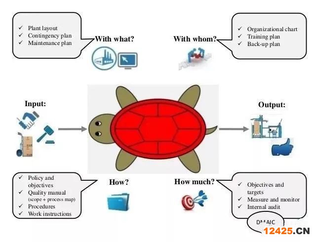 而要建立這些管理文件,公司必須開展系統(tǒng)的過程分析活動,IATF (International Automotive Task Force)國際汽車工作組推薦了一種單一過程分析圖,因形似烏龜而稱為烏龜圖。