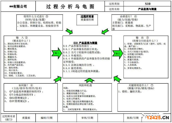 是用來分析過程的一種工具,是通過形體語言來表示被識別過程的六個關(guān)鍵問題(輸入、輸出、使用資源、負責人、活動的依據(jù)、評價活動的指標)的圖示,該圖分別以烏龜?shù)念^部、尾巴、四只腳和腹部表示六個關(guān)鍵問題。