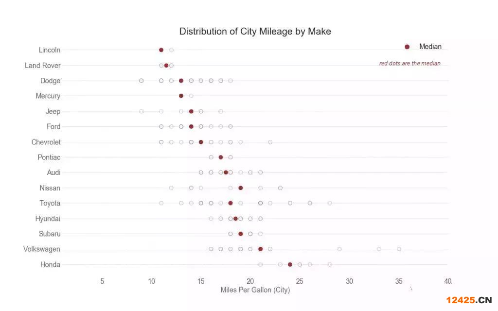 包點圖表傳達了項目的排名順序,并且由于它沿水平軸對齊,因此您可以更容易地看到點彼此之間的距離。