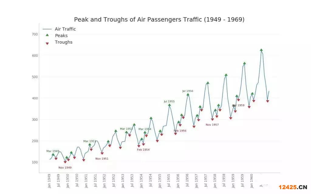 時間序列圖用于顯示給定度量隨時間變化的方式。 在這里,您可以看到 1949年 至 1969年間航空客運量的變化情況。