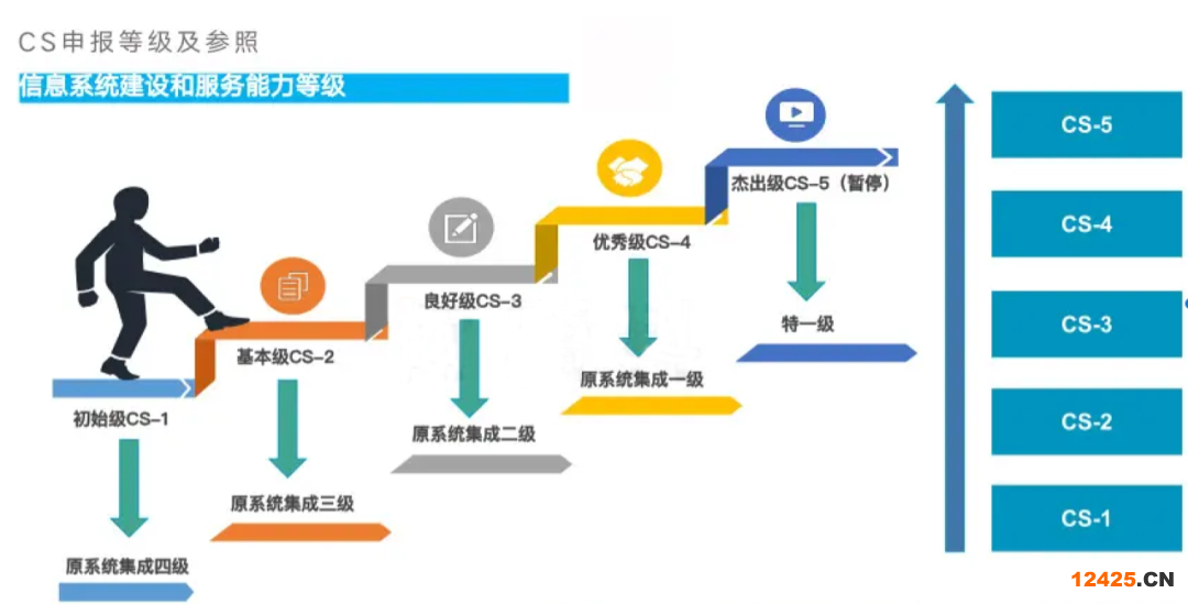 信息系統(tǒng)建設(shè)和服務(wù)能力劃分為五個等級:等級從低到高分別用CS1級(初始級)、CS2級(基本級)、CS3級(良好級)、CS4級(優(yōu)秀級)、CS5級(杰出級)。
