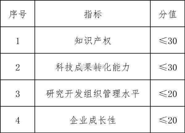 企業(yè)創(chuàng)新能力主要從知識(shí)產(chǎn)權(quán)、科技成果轉(zhuǎn)化能力、研究開(kāi)發(fā)組織管理水平、企業(yè)成長(zhǎng)性等四項(xiàng)指標(biāo)進(jìn)行評(píng)價(jià)。各級(jí)指標(biāo)均按整數(shù)打分,滿分為100分,綜合得分達(dá)到70分以上(不含70分)為符合認(rèn)定要求。四項(xiàng)指標(biāo)分值結(jié)構(gòu)詳見(jiàn)下表: