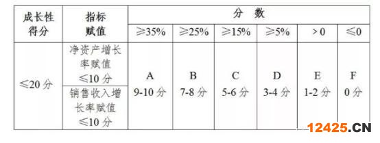 用凈資產(chǎn)增長率和銷售收入增長率分別對照下表指標(biāo)評價(jià)檔次(ABCDEF)評出分?jǐn)?shù)比例,用分?jǐn)?shù)比例乘以賦值計(jì)算出每項(xiàng)得分,兩項(xiàng)得分相加計(jì)算出凈資產(chǎn)和銷售額成長性指標(biāo)實(shí)際得分。