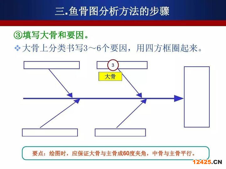 3.畫大骨,一般畫六條大骨,與主骨呈60度角。這六條大骨就是分析問題的六個方面,“人、機、料、法、環(huán)、測”,即“5M1E”