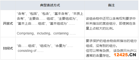 組合物權(quán)利要求可以分為開放式和封閉式兩種表達(dá)方式。開放式表示組合物中并不排除權(quán)利要求中未指出的組分;封閉式則表示組合物中僅包括所指出的組分而排除所有其他的組分。[6]這兩種權(quán)利要求撰寫方式的常見情形可參見下表。