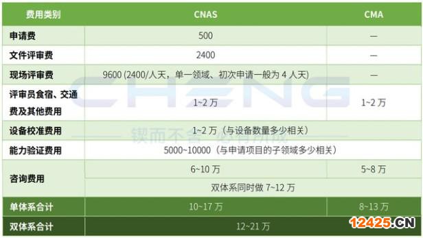 經(jīng)常有客戶問,申請CMA和CNAS需要多少費(fèi)用。我們先來看CNAS所需要的費(fèi)用。申請費(fèi)是500元,文件評審費(fèi)是2400元,現(xiàn)場評審費(fèi)是2400元/人天,初次申請的實(shí)驗(yàn)室如果只有1個(gè)領(lǐng)域的話,一般是4個(gè)人天,總共9600元。評審員食宿、交通費(fèi)及其他費(fèi)用,一般需要一到兩萬元。設(shè)備校準(zhǔn)費(fèi)用與實(shí)驗(yàn)室設(shè)備數(shù)量的多少相關(guān),約為一到兩萬元。能力驗(yàn)證費(fèi)用與申請項(xiàng)目的子領(lǐng)域多少相關(guān),約為5000到1萬元。體系咨詢費(fèi)用約為6到10萬元。單獨(dú)做CNAS全部費(fèi)用大約為10到17萬元。