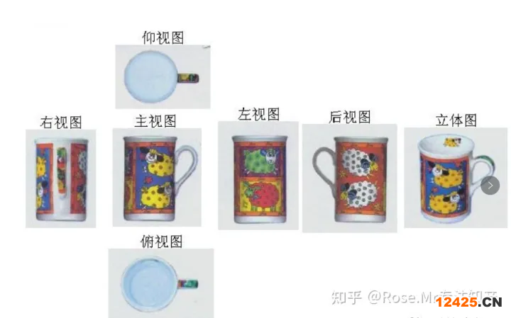 2、杯子外觀專利申請的六視圖參照下圖所示,六視圖可以理解為將一個物品放置在設(shè)置有六個投影面的正六面體空間里,然后在面向物體的六個方向分別照射來一束光,在光面向的投影面上。