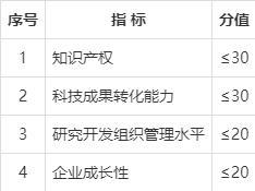 企業(yè)創(chuàng)新能力主要從知識產(chǎn)權、科技成果轉(zhuǎn)化能力、研究開發(fā)組織管理水平、企業(yè)成長性等四項指標進行評價。各級指標均按整數(shù)打分,滿分為100分,綜合得分達到70分以上(不含70分)為符合認定要求。