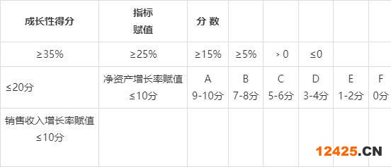 以上兩個指標分別對照下表評價檔次(ABCDEF)得出分值,兩項得分相加計算出企業(yè)成長性指標綜合得分。