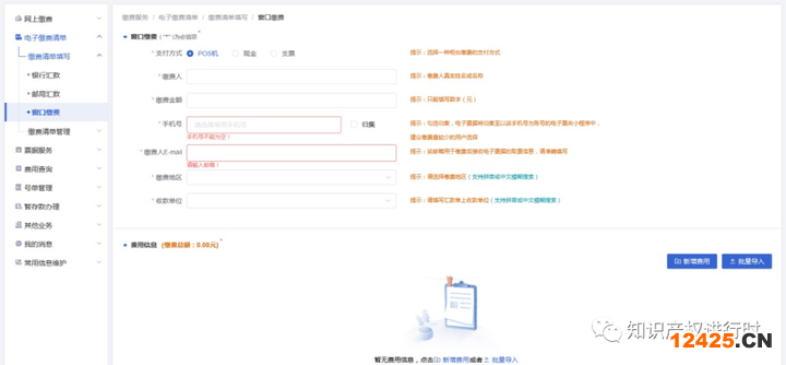 與網(wǎng)上繳費(fèi)類似,電子繳費(fèi)清單的費(fèi)用信息也可以通過(guò)在線填寫(點(diǎn)擊“新增費(fèi)用”)和批量模板上傳(點(diǎn)擊“批量導(dǎo)入”)兩種方式提交,在確認(rèn)無(wú)誤后可生成電子繳費(fèi)清單。需要注意的是銀行、郵局匯款填寫的匯款人應(yīng)與匯款賬戶一致;窗口繳費(fèi)選擇支票支付方式填寫的繳費(fèi)人必須與支票加蓋的財(cái)務(wù)專用章一致,如有需要可填寫統(tǒng)一社會(huì)信用代碼,且需要確保和費(fèi)用信息中的票據(jù)抬頭、統(tǒng)一社會(huì)信用代碼一致。
