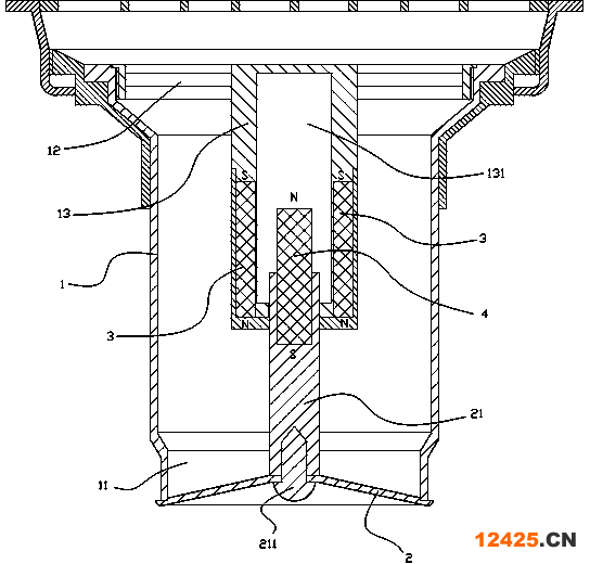 “5.如權(quán)利要求1所述的一種磁吸式直通組合型地漏,其特征在于:或者所述外磁條的磁極分布在內(nèi)外兩側(cè),內(nèi)磁條的磁極分布在上下兩端,且外磁條的內(nèi)端磁極與內(nèi)磁條的上端磁極相同,外磁條的內(nèi)端磁極與內(nèi)磁條的下端磁極相異;所述內(nèi)磁條頂端隨密封蓋導(dǎo)桿下移到極限位置時其高度不低于外磁條的頂端高度。”