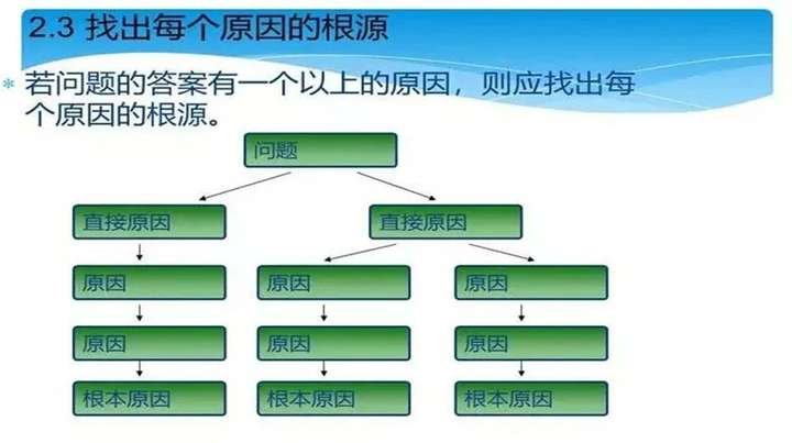 鼓勵解決問題的人要努力避開主觀或自負(fù)的假設(shè)和邏輯陷阱,從結(jié)果著手,沿著因果關(guān)系鏈條,順藤摸瓜,直至找出原有問題的根本原因。