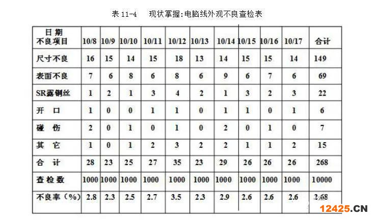 這個(gè)案例首先是一個(gè)研究理由,然后改善目標(biāo)然后、現(xiàn)狀把握,這個(gè)在QC手法里面叫做查檢表,就是把記錄記下來,什么尺寸不良、表面不良、碰傷、其他等等,然后把不良率統(tǒng)計(jì)出來,有了不良率就做柏拉圖分析。