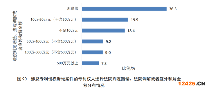 根據(jù)國家知識產(chǎn)權(quán)局發(fā)布的《2022年中國專利調(diào)查報告》顯示,針對專利侵權(quán)訴訟案件的法院判定賠償、法院調(diào)解或庭外和解金額,專利權(quán)人選擇在10萬—50萬元(不含50萬元)和不足10萬元的比例較高,分別為19.9%和 18.4%。選擇金額在50萬—100萬元(不含 100萬元)、100萬—500萬元(不含 500 萬元)和500萬元以上的專利權(quán)人占比分別為 9.2%、9.0%和 7.3%。無賠償?shù)膶@麢?quán)人比例為 36.3%。具體如下表所示: