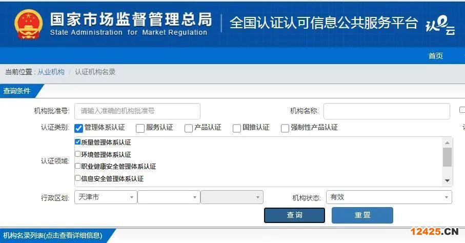 3. 進(jìn)入管理體系認(rèn)證頁面,按照需要的認(rèn)證領(lǐng)域、行政區(qū)劃進(jìn)行選擇。 點(diǎn)擊顯示的機(jī)構(gòu)名錄列表,即可查詢機(jī)構(gòu)信息詳情。也可直接錄入機(jī)構(gòu)批準(zhǔn)號、機(jī)構(gòu)名稱進(jìn)行信息查詢。(可用此方法查詢機(jī)構(gòu)是否取得相應(yīng)資質(zhì))