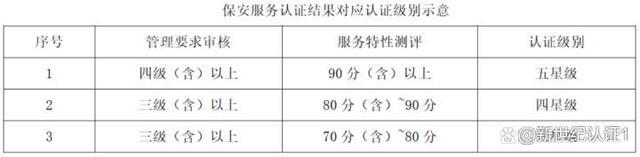 保安服務認證主要依據(jù)GA/T594-2006《保安服務操作規(guī)程與質量控制》。此標準規(guī)定了保安服務具體的操作規(guī)程,以及服務質量應達到的基本要求。由審查員根據(jù)不同認證模式,采取現(xiàn)場觀察、詢問及內(nèi)外部相關文件記錄資料的查閱,或公開或暗訪的方式實施。最終服務認證結果從低到高,分為3個等級,即三星級至五星級。(如下圖)